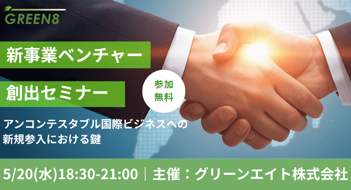日本・アジア・欧米各地域にて国際物流事業を展開するグリーンエイト株式会社は、海外進出を目指す起業志向者・中小企業における新規事業開発責任者などを対象としたセミナー「アンコンテスタブル国際ビジネスへの新規参入における鍵」を2026年5月20日(水)に、東京都中央区にて開催いたします。